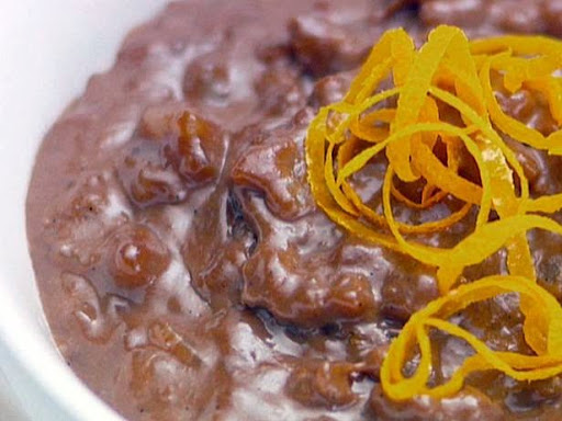 In a heavy, medium saucepan, combine the milk, rice, sugar, and orange zest. Scrape in the seeds from the vanilla bean and add the bean to the saucepan. Bring the milk to a boil, stirring occasionally. Reduce the heat to medium-low and simmer, stirring frequently, until the rice is tender and the mixture thickens, about 35 to 40 minutes. Remove the pan from the heat and discard the vanilla bean. Stir the cocoa powder and orange liqueur into the mixture. Add the chocolate chips and stir until melted. Allow the mixture to cool for 10 minutes, stirring occasionally.