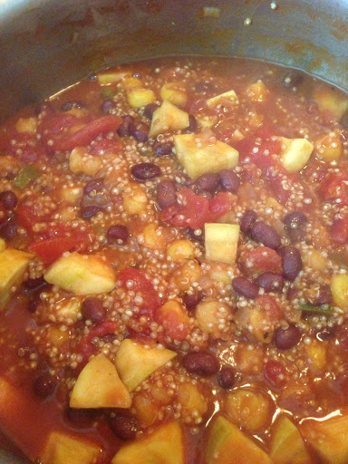 Stir in the diced tomatoes, tomato sauce, and vegetable broth. Bring to a boil then reduce to a simmer cook for 15 minutes. Add in black beans, hominy, quinoa, zucchini, Frank’s, smoked paprika, cumin, salt, and pepper. Continue to cook 15 more minutes, until flavors have melded.