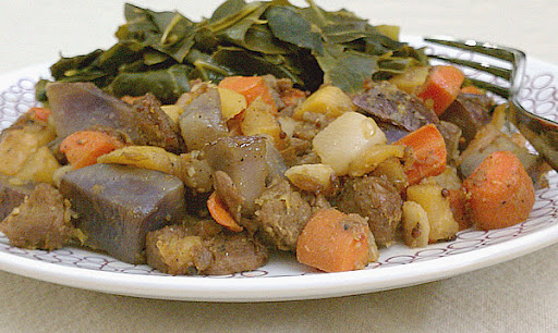 Add roasted veggies and beefless chunks and cook until they are heated through. Then add the mustard, ketchup, and smoked salt and mix in well.