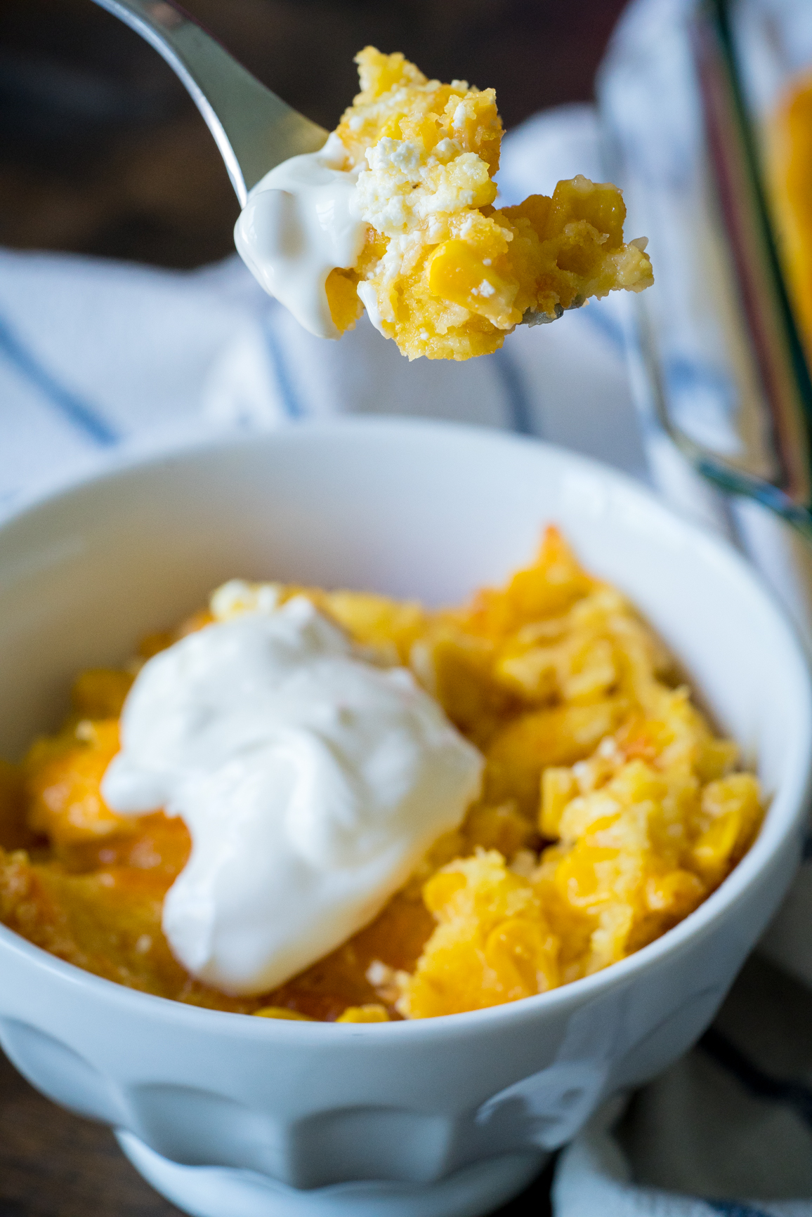 Spoon sour cream over corn mixture, then gently swirl it in using a knife or tooth pick.