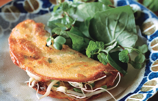 Cut pancakes into wedges. To eat, tuck each wedge inside a lettuce leaf along with some herbs and dip in Nuoc Cham.