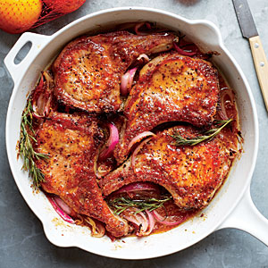 3. Heat a large ovenproof skillet over medium-high heat. Add oil; swirl to coat. Sprinkle pork with salt and pepper. Add to pan; cook 5 minutes or until browned. Turn pork; add rosemary and onion to pan. Pour juice mixture over pork; bake at 425° for 10 minutes or until a thermometer registers 140°. Place onion and rosemary on a platter. Return pan to medium-high heat; add lime juice. Cook 4 minutes or until liquid is syrupy. Add pork to platter; drizzle with sauce.