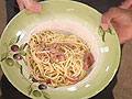 Bring a pan of salted water to a boil. Cook both packages of spaghetti until al dente, drain and immediately add egg mixture to pasta. The eggs are actually cooked by the pasta. (Make sure the eggs are thoroughly cooked before proceeding.) Stir the egg mixture until it is well mixed. Pour in the mixture from the frying pan and stir. Finish with the Parmesan cheese and serve!