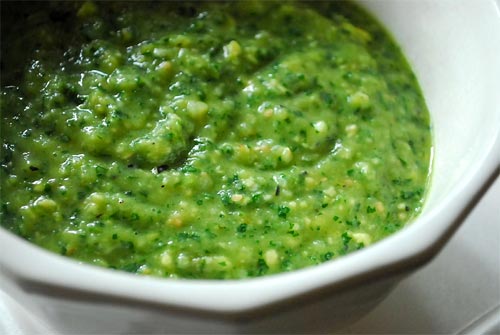 Agrega las verduras recién cocidas en una licuadora y agrega una pizca de sal y las ramas de cilantro. Revuelve muy bien hasta que la mezcla quede espesa. Si no se muele bien, agrega unas cucharadas del agua donde herviste las verduras y listo.