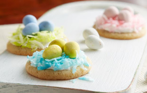 Frost cookies. Immediately sprinkle with coconut and top with 2 to 3 candy eggs. Makes about 8 dozen (1 3/4 inch) cookies.