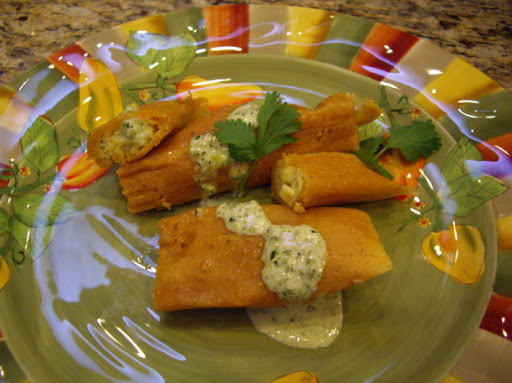 Spread the Masa on the soaked corn husks, and then place the cheese and corn mixture down the middle. Fold, and place on large baking sheet until all tamales are filled.