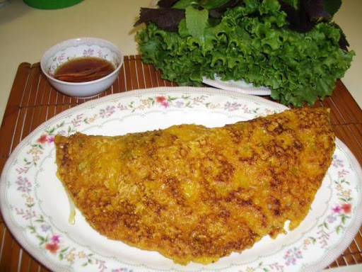1 Place pork loin in a saucepan; cover with water and bring to a boil over medium heat; simmer until cooked through, about 20 minutes. 2 Allow pork to cool, then julienne into strips. 3 Shell and devein shrimp; slice each one in half lengthwise. 4 Rinse herbs and drain; set aside. 5 In a mixing bowl, prepare batter by mixing rice flour, self-rising flour, water, coconut milk, curry powder, sugar, salt, and green onion until smooth. 6 Divide pork, shrimp, onion, and bean sprouts into 5 separate little piles for easy access during cooking. 7 Heat 1 tbsp oil in non-stick frying pan until hot; cook pork shrimp and onion until it starts to sizzle; add 1/2 cup of batter and swirl to cover pan and get batter underneath. 8 Place one pile of bean sprouts towards the center of the crepe, then cover the pan tightly. 9 Turn the heat down to medium and cook for 2-3 minutes, then uncover and loosen edges of crepe and fold over with a spatula to form an omelette. 10 Transfer the crepe to a serving platter. 11 Repeat process with rest of batter. 12 Do not cover the cooked crepes or stack them (they will lose their crispness- they should remain light and airy). 13 To serve, place one crepe on a plate with some lettuce leaves, herbs also with a small bowl of nuoc cham. 14 The person cuts a portion of crepe, wraps it in a leaf of lettuce with some herbs, and dips it in the sauce.