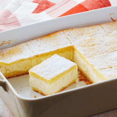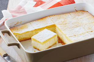 WHISK remaining eggs, sugar, flour, butter, milk and baking powder in separate bowl until blended. Spread 1/3 of the batter onto bottom of 13x9-inch baking dish sprayed with cooking spray; cover with Neufchatel mixture, then remaining batter.