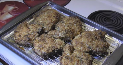 DIP pork chops into beaten egg; then coat with onion crumbs, pressing firmly to adhere. Place chops on baking sheet.