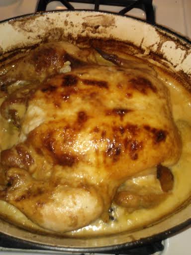 While chicken is browning mix together the rest of the ingredients in a bowl. Carefully turn chicken over and continue browning the breast side, again until a nice brown crust has formed. When completely browned drain off most of the oil. Leaving the chicken breast side down in the pan pour the mixture over the chicken, sprinkle with salt, cover and place in the oven. Cook covered for 40 minutes. Remove the cover and carefully turn the chicken over. Place back into the oven uncovered and continue to cook another 35-45 minutes, basting the chicken with the liquid every 15 minutes or so. Sprinkle with cilantro and scallion tops. Serve with jasmine rice.