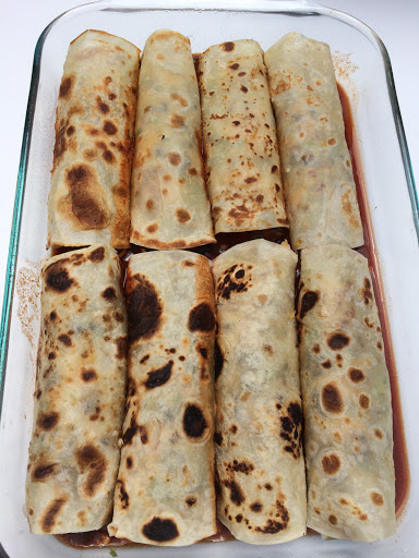 5. Pour the remaining red sauce on top of the tortillas. Sprinkle cheese on top if you like. Freeze for later or bake now.