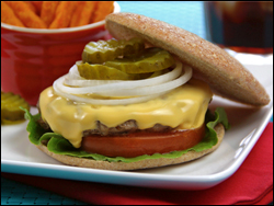 Transfer cheese-topped patty to the bottom half of the bun. Top with onion and pickles, and place the top half of the bun over the stack!