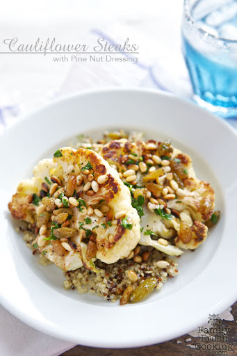 To serve the cauliflower steaks, melt the butter in a large sauté pan over medium heat. Brown the cauliflower in the butter, about 3 minutes per side, until browned like a steak. Remove to a serving dish & drizzle with the dressing.