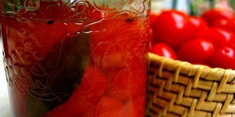 Pack whole tomatoes into quart/litre jars with a few thyme sprigs, a couple of bay leaves, and an onion slice or two. Close the lids and set the jars on a rack in a deep pan.