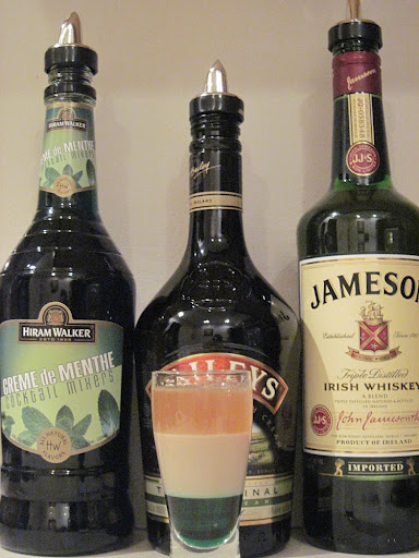 In a tall, skinny shot glass, first pour the Creme de Menthe. Then, pouring slowly over a barspoon or other small spoon, round side up, add the Bailey's. The Bailey's should float on top of the Creme de Menthe. Repeat the spoon process to pour the Jameson over the Bailey's. If at first you don't succeed, try, try again.
