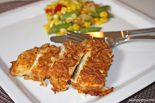 Place coated chicken in dish and bake for 45 min to 1 hr uncovered (cooking time depends on the size of your chicken breast). Do not flip halfway through. It will be done when the coating is browned, and when pierced, its no longer pink and the juices run clear.