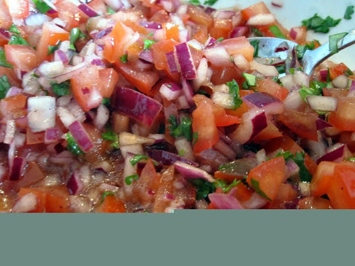 1. Place the onion in a bowl with ice water to cover. Let stand for 30 minutes, then drain well in a colander and blot dry with a paper towel. 2. Combine the vinegar and salt in a bowl and stir or whisk until the salt crystals are dissolved. Add the onion, tomato, pepper, cayenne, oil, and cilantro and gently toss to mix. Correct the seasoning, adding salt, vinegar or cayenne; the relish should be highly seasoned. The relish is good now; it will be amazing if you let it stand to ripen for a few hours before serving. Serve the relish the same day you make it.
