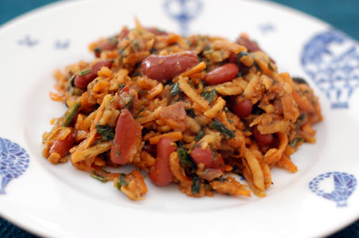 Sweet potatoes and pinto beans team up with a smoky barbecue sauce in this lip-smacking bowl of goodness. Use the shredding disk on your food processor to make short work of shredding the sweet potato. (Recipe printed with permission - from More Quick-Fix Vegan by Robin Robertson: http://www.amazon.com/More-Quick-Fix-Vegan-Delicious-Recipes/dp/1449446132/)