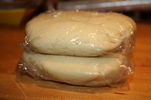 2. Sprinkle vodka and water over mixture. With spatula use folding motion to mix, pressing down on dough until dough is slightly tacky and sticks together. Divide dough into two even balls and flatten each into 4 inch disk. Wrap each in plastic and refrigerate for 1 hour.