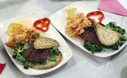 Toast the bread. Add a dollop of the coleslaw on each slice and top with the burger.