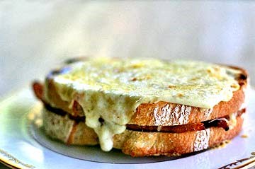 1 Preheat oven to 400°F. 2 Make the béchamel sauce. Melt butter in a small saucepan on medium/low heat until it just starts to bubble. Add the flour and cook, stirring until smooth, about 2 minutes. Slowly add the milk, whisking continuously, cooking until thick. Remove from heat. Add the salt, pepper, and nutmeg. Stir in the Parmesan and 1/4 cup of the grated Gruyère. Set aside. 3 Lay out the bread slices on a baking sheet and toast them in the oven, a few minutes each side, until lightly toasted. For extra flavor you can spread some butter on the bread slices before you toast them if you want. (Alternatively, you can assemble the sandwiches as follows in step four and grill them on a skillet, finishing them in the broiler with the bechamel sauce.) 4 Lightly brush half of the toasted slices with mustard. Add the ham slices and about 1 cup of the remaining Gruyère cheese. Top with the other toasted bread slices. 5 Spoon on the béchamel sauce to the tops of the sandwiches. Sprinkle with the remaining Gruyère cheese. Place on a broiling pan. Bake in the oven for 5 minutes, then turn on the broiler and broil for an additional 3 to 5 minutes, until the cheese topping is bubbly and lightly browned. If you top this sandwich with a fried egg it becomes a Croque Madame. Makes 4 sandwiches.