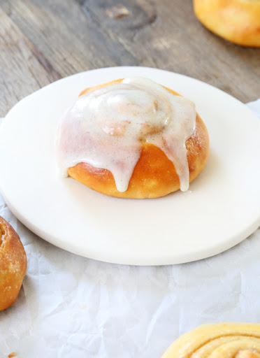 Shaping/filling the dough + the final rise. On a lightly floured surface, divide the dough into two equal portions. Cover one lightly with a moist tea towel to prevent it from drying out while you shape the other. Pat the remaining half of dough into a thick rectangle (about 1 inch thick), and transfer to a lightly greased piece of unbleached parchment paper. On the parchment paper, roll out the dough into a rectangle about 1/4-inch thick, and 8-inches wide x 10-inches high, sprinkling very lightly with more bread flour as necessary to prevent the rolling pin from sticking to the top of the dough. Dust off any excess flour from the surface of the rectangle facing up, and brush the melted butter in an even layer on top, covering the entire surface. Sprinkle half of the brown sugar and cinnamon mixture for the filling in an even layer on top of the melted butter, and press gently to help the sugar mixture adhere to the dough. Using a pizza or pastry cutter or a very sharp knife and starting at a short side, slice the rectangle into 4 equal strips, each 2-inches wide (and 10-inches long). Starting at a short side, roll each strip into a tight coil. Transfer to the prepared baking sheet, placing each coil of dough 3-inches apart from the others. Repeat with the remaining half of the dough, making 4 more coils. Using the palm of your hand, press down firmly on each coil, one a time, until it is compressed into a flat disk, about 1-inch high. Cover the baking sheet with a piece of oiled plastic wrap, and place in warm, draft-free location to rise only until the buns are just beginning to swell (about 30 minutes, but it could be more if your rising environment is particularly cold and/or dry). Do not overproof.