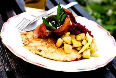 8. Servera raggmunken med knaprigt fläsk, äpplen och salladslöken med rårörda lingon på toppen.