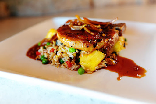 To serve, pile rice on a plate, then top with a pork chops and onions from the sauce. Drizzle a little bit of sauce over the top.