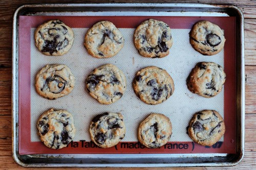 6.Set up a sheet pan with a silpat or parchment paper. Bake one tray at a time or they will all cook at different rates. Make them spherical, not flat. The cookie size is up to you. I find the bigger they are, the better ratio you have between gooey interior and crisp exterior. 2 ounces is about right for that.