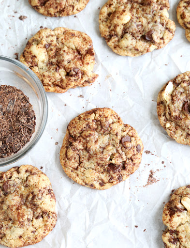In the bowl of a stand mixer fitted with the paddle attachment (or a large bowl with a handheld mixer), cream the butter on medium-high speed until it is light and fluffy. Add the granulated sugar and brown sugar, and then the egg and vanilla and beat on medium-high speed until the mixture is smooth and light. Add the dry ingredients and the milk, and mix on medium speed until just combined. If the dough is very, very stiff, add more milk by the teaspoon until it can be stirred without too much difficulty. Add the chocolate chips and nuts, and mix by hand until they are evenly distributed throughout the dough. Remove the grated/chopped chocolate from the refrigerator, uncover it, and fold it carefully into the cookie dough, taking care not to melt it.