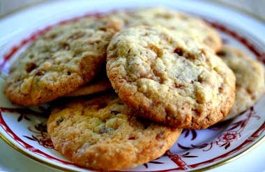 1 Sift together the flour, salt, and baking soda. Set aside. In a separate bowl, combine Heath Bar pieces and chopped walnuts. Set aside. 2 Cream butter until fluffy. Add the sugar and continue to beat until light and fluffy (a couple minutes). Beat in eggs one at a time, and vanilla. 3 Alternatively mix in the Heath Bar mixture and the flour mixture, a third at a time, until well blended. Chill cookie dough for at least 30 minutes (better an hour). 4 Preheat oven to 350°F. On cookie sheets lined with parchment paper or Silpat, spoon out the cookie dough in small 1-inch diameter balls (size of a large marble). Place dough balls 3 inches away from each other on the cookie sheets. (Make sure there is plenty of room between the cookie balls, and that the cookie balls aren't too big. These cookies spread!) 5 Bake for 10-12 minutes, until the edges are just starting to brown. Remove from oven and let cool for a few minutes. Then transfer the cookies to a wire rack to cool completely.