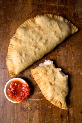3. Heat 2” oil in a 6-qt. saucepan until a deep-fry thermometer reads 350°. Divide the dough into 6 balls. On a lightly floured surface, roll balls into six 9” circles. Place ⅔ cups of cheese mixture on one side of each circle, leaving a 1” border. Fold other half of circles over, and seal with a fork. Working with one calzone at a time, fry, turning once, until golden and puffed, about 5 minutes. Using tongs, remove calzone and drain briefly on a paper towel-lined plate. Transfer to a serving platter and serve with warm marinara sauce.