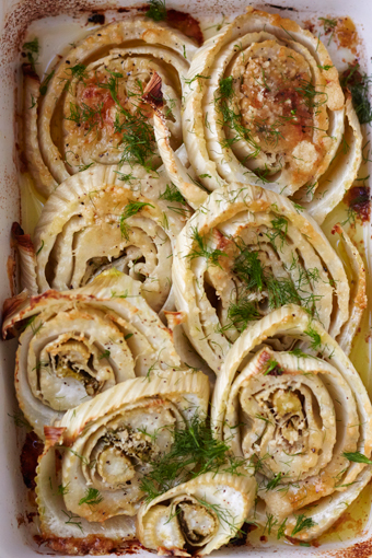 Preheat the oven to 375°F. Lightly oil a 13” × 9” × 2” glass baking dish. Arrange the fennel in the dish. Sprinkle with salt and pepper, then with the Parmesan cheese. Drizzle with the oil.
