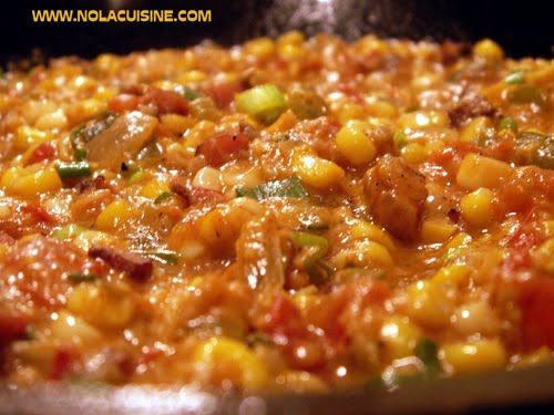 Maque Choux (pronounced Mock-shoe) is creamy, rich stewed corn dish that is most certainly Cajun. The trick to good Maque Choux is using very fresh corn so that you can scrape the pulp and milk out of the cobs which will give the dish it’s distinctive creaminess.