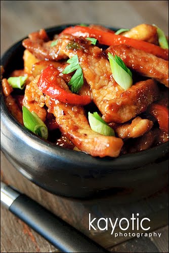 I’m starting with apricot jelly because, well, that’s what I found in the fridge. Could have been orange or peach jelly as well. I’m so easy going! Drop 3 tbsp in a bowl. Add 2 tbsp honey, 1 tbsp soy sauce, 1/2 (or 1) tsp sesame oil and 1 tsp grated ginger to the jelly. Also add a chopped or grated garlic clove and about 1/3 minced chili pepper. Nah, it’s not going to make it hot hot, it’ll add a bit of warmth is all. Live a little! Add a good pinch of salt and whisk. Pork cutlets. I always keep some in the freezer. You can do so much with them. I’ve cut up 6 pork cutlets. You could do this with chicken as well.Throw them in with the marinade and set the bowl aside for 15 minutes or so. Enough time to move on to the next level. This is completely optional; I just like to add a little extra flavor and crunch to the pork strips as well. I’ve thinly sliced 3 spring onions and about 1/2 a juicy red bell pepper. Heat 1 tbsp oil. Let the pan get really, really sizzling hot and throw in the pork strips. Sauce and all. Cook over very high heat. Now the trick is to not stir for a while. Refrain… leave them be. Pork strips are cooked in no time, but we also want the jelly and honey to caramelize and stick to the meat. And we want the sauce to cook down. So many wishes … After a few minutes—when you see the strips kinda turn white on the bottom—you flip them over. Add the bell pepper and spring onions. Keep a few spring onions behind for garnish. In no time the meat will start to brown, the sauce will have cooked down and you end up with delightfully sweet and savoury pork strips. Don’t overcook them! Nothing worse than dried out, overcooked sad excuses for pork strips. Good food doesn’t have to be complicated and fancy. It can be as easy as pork cutlets. Serve with rice and string beans, and you have a fantastic meal!