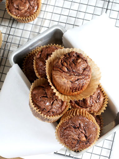 In a large bowl, place the flour, xanthan gum, cornstarch, baking powder, baking soda, salt and sugar, and whisk to combine well. Create a well in the center of the dry ingredients, and add the butter, eggs, vanilla, buttermilk (or sour cream) and mashed bananas, mixing to combine after each addition. The batter should be thick (thicker if you used sour cream), but fluffy. Fill the prepared muffin cups nearly full (a bit more than 3/4 of the way full), and add a dollop of Nutella (about 1/2 teaspoon for the full-sized muffins and about 1/3 teaspoon for the mini muffins) to the top of each. With a toothpick, swirl the Nutella into the batter in each cup.