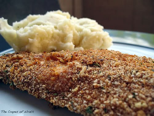 1. Mix together the buttermilk, 1/4 teaspoon garlic powder, 1/2 teaspoon salt, and 1/2 teaspoon black pepper in a shallow dish large enough for all of your chicken breasts (I used Tupperware). 2. Pound your chicken breasts to an even thickness or slice them in halves if they’re large. Place all of the chicken breasts in the buttermilk mixture and place in the fridge for as little as 30 minutes or as long as overnight. I left mine in there for about 6 hours. 3. In another shallow dish such as a pie dish, combine the 1 cup dry bread crumbs, 1 teaspoon garlic powder, 1/2 teaspoon onion powder, 1 teaspoon dried parsley, 1 teaspoon dried oregano, 1/2 teaspoon dried thyme, 1/2 teaspoon dried basil, 1 teaspoon kosher salt, 1/2 teaspoon black pepper, 1 teaspoon chili powder, and 1/2 teaspoon smoked paprika. 4. Take each breast, one at a time, from the buttermilk (don’t bother shaking the buttermilk off) and place it in the bread crumb mixture. Coat well. 5. Gently place each one of the chicken breasts on a rack that is set on a sheet pan lined them with the parchment paper or foil. Make sure they aren’t touching, and put the whole thing in the refrigerator for 30 to 60 minutes. This will make the breading really stick to the chicken (it really does!). You can go straight from breading to baking, but this extra step does give you a crispier coating. 6. Preheat the oven to 400 degrees F when you’re ready. Place the chicken directly onto your lined pan (I greased mine quickly with some Pam) and bake for 12 minutes on one side, then flip them and bake for another 8-10 minutes on the other side. Serve with potatoes, vegetables, or whatever. Serves 3 (and leftovers make a great sandwich or salad).