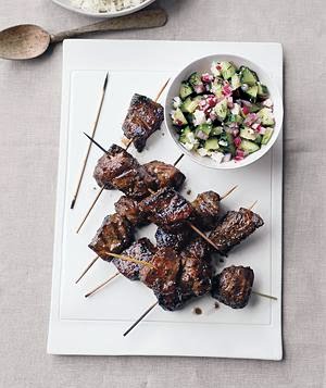 Meanwhile, in a small bowl, combine the cucumber, Feta, onion, dill, oil, lemon juice, and 1/4 teaspoon each salt and black pepper. Serve the kebabs with the rice and relish.