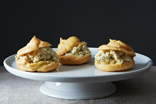 7. Transfer to a rack to allow profiteroles to cool completely. Once cooled, cut in half, and fill with the set frozen pistachio mousse, using a spoon.