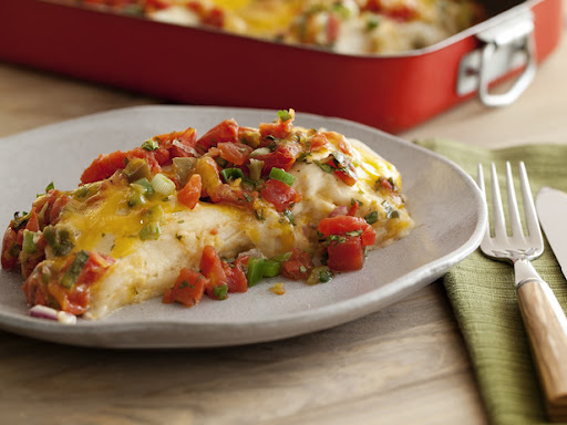 Bake for 15 minutes in a preheated 350 degree F oven until cheese melts. Garnish with cilantro, scallion, sour cream and chopped tomatoes before serving. Serve with Spanish rice and beans.