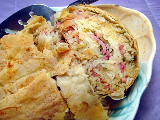 1 Saute onion in 1 tbsp melted butter in a large saucepan over medium-high heat, stirring constantly, until tender. Add the chicken broth and bring to a boil. Stir in rice; cover, reduce heat, and simmer 15 to 20 minutes or until rice is tender and the liquid has been absorbed. Set aside, and let cool. Stir in parsley. 2 Work with 1 sheet of phyllo at a time, keeping the remaining sheets covered with a slightly damp towel so they don't dry out. Layer phyllo sheets on a work surface, brushing each sheet with the remaining 3/4 cup plus 3 tablespoons melted butter. Spoon the reserved rice mixture over phyllo, spreading to within 1 inch of sides. Sprinkle the ham over the rice mixture, then top with the cheeses. 3 Starting at the short side, fold the phyllo over 1 inch; fold each long side over 1 inch. Roll up phyllo, starting with the short side. Place the phyllo, seam side down, on a lightly greased broiling rack in a broiler pan. Brush with any remaining melted butter. Make several diagonal slits, about 1/4 inch deep, across the top of the pastry with a sharp knife. Sprinkle with paprika. Bake uncovered at 375 degrees for 35 to 40 minutes or until golden. 4 Let stand 5 minutes before serving.