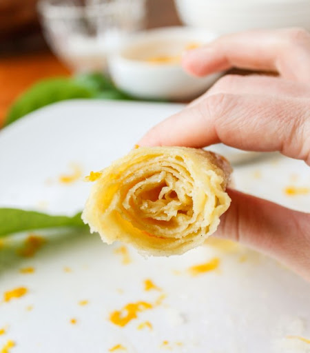 To serve, lay a warm crepe flat on a plate and brush generously with warm Meyer lemon juice. Sprinkle with 1-3 tablespoons sugar. Top with a sprinkling of zest. Then either fold the crepe into quarters or roll it. I folded mine in half, then rolled. Top with additional juice, sugar, and zest.
