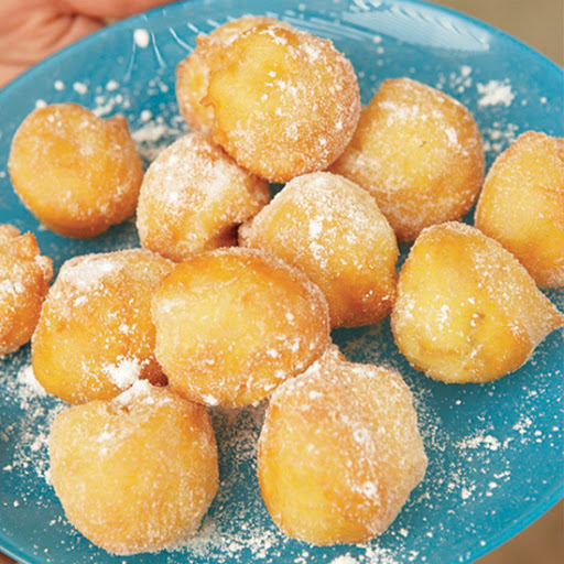 In a saucepan, heat the oil to 375°. Line a baking sheet with paper towels. Scoop 10 scant tablespoons of the dough into the oil and fry, turning, until golden and puffed, 6 minutes. Transfer the beignets to the baking sheet and poke a small hole in the side of each to release steam. Repeat with the remaining dough.