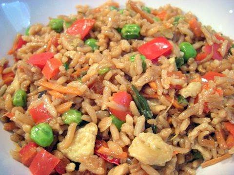 Heat large non stick skillet over high heat. Add 1 tablespoon vegetable oil to the pan. Add eggs, scramble, then remove. Add rest of oil to pan. Add garlic, then ginger, then carrots, and scallions. Quick fry veggies a few minutes to your liking. Add rice and combine with veggies. Incorporate the scrambled eggs and cook another 2-3 minutes. Add peas and dark soy sauce-tamari-to your liking- and cook 1 more minute then serve.