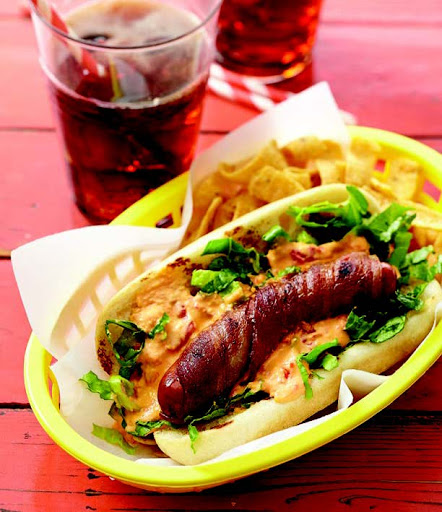 Wrap bacon around hot dogs and secure each end with toothpicks. Grill hot dogs until bacon is crisp (remove toothpicks before serving).