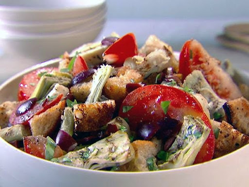 Place a grill pan over medium-high heat or preheat a gas or charcoal grill. Drizzle the bread and artichoke hearts with olive oil and season with salt and pepper. Grill the bread and artichokes until golden brown at the edges, about 6 minutes total, turning every 2 to 3 minutes. Remove the bread and artichokes from the grill and transfer to a large bowl.