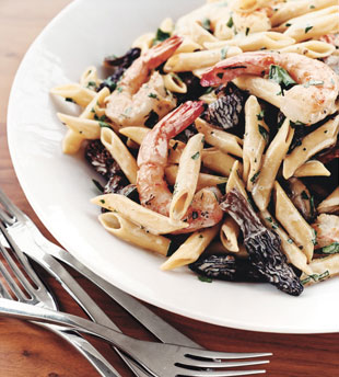 Add mushroom sauce, parsley, and shrimp to pasta in pot. Toss over medium-high heat until warmed through, adding more mushroom soaking liquid (leaving sediment in bowl) if pasta is dry. Season with salt and pepper. Transfer to large bowl.