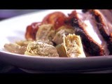 Trim the tough dark green skin from the stem of the artichoke if there is a stem, and remove the tough outer leaves until lovely gentle spring green is revealed, it should only be a couple of layers. Cut the artichokes in half lengthwise and toss into the lemon (acidulated) water. Artichokes will turn brown before your eyes, so it is important to have the acidulated water set up before 1 leaf is removed from the artichoke.