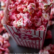 Place popcorn in a very large bowl – the biggest one you have. Pour crushed candy canes on top of the popcorn. (I crush my candy canes in the food processor – it is quick and it pulverizes the candy canes!)