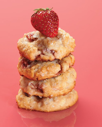 Preheat oven to 375 degrees. Combine strawberries, lemon juice, and 2 tablespoons granulated sugar. Whisk together flour, baking powder, salt, and remaining 7 tablespoons granulated sugar in a large bowl. Cut in the butter with a pastry cutter, or rub in with your fingers, until mixture resembles coarse crumbs. Stir in cream until dough starts to come together, then stir in strawberry mixture.